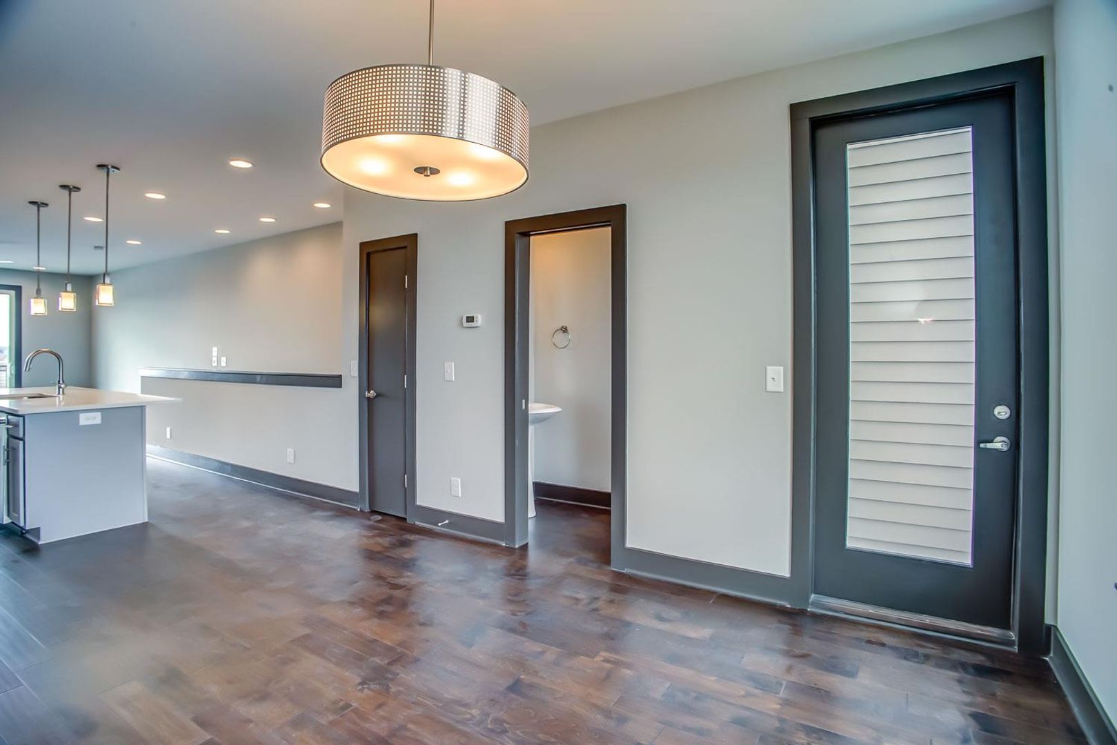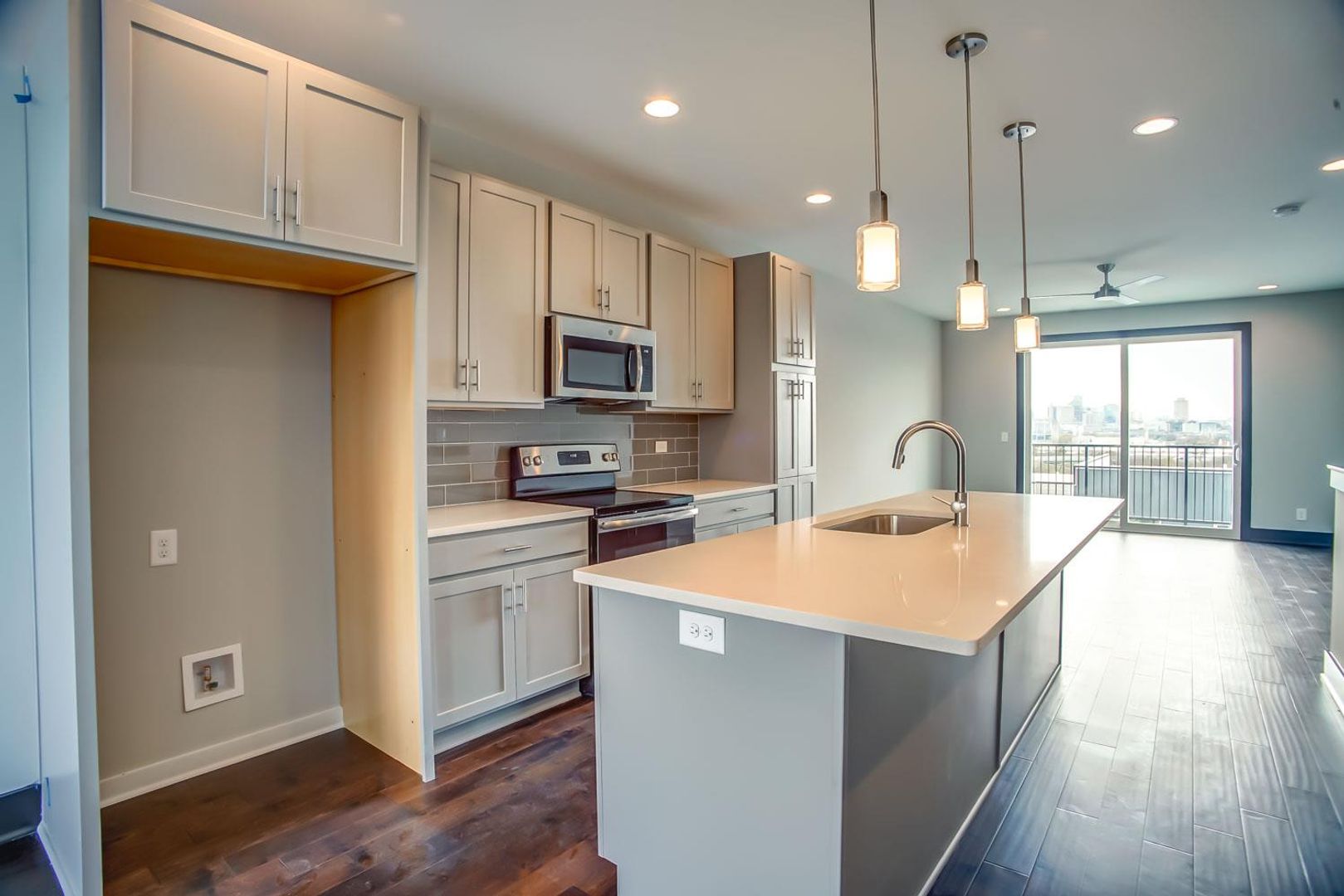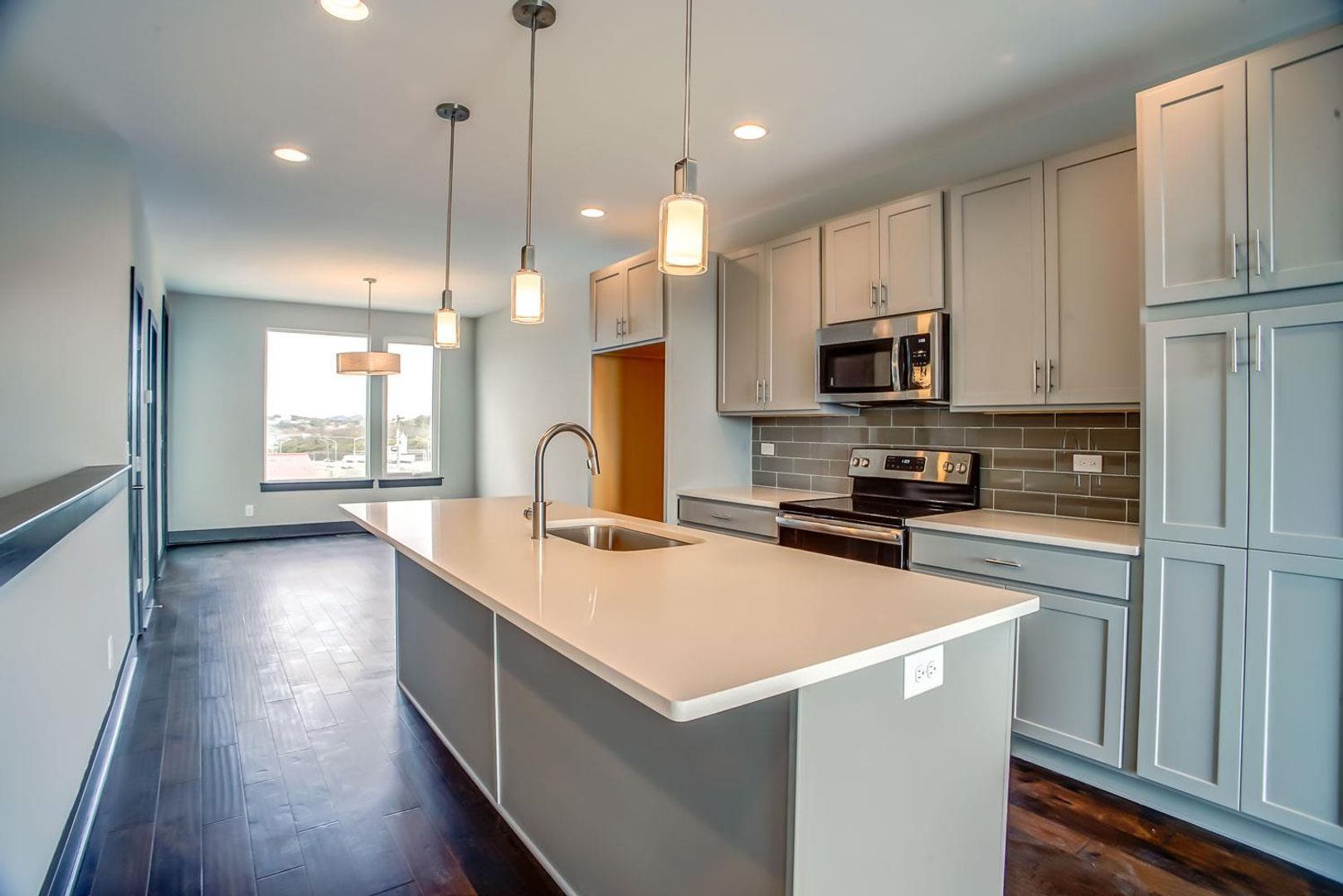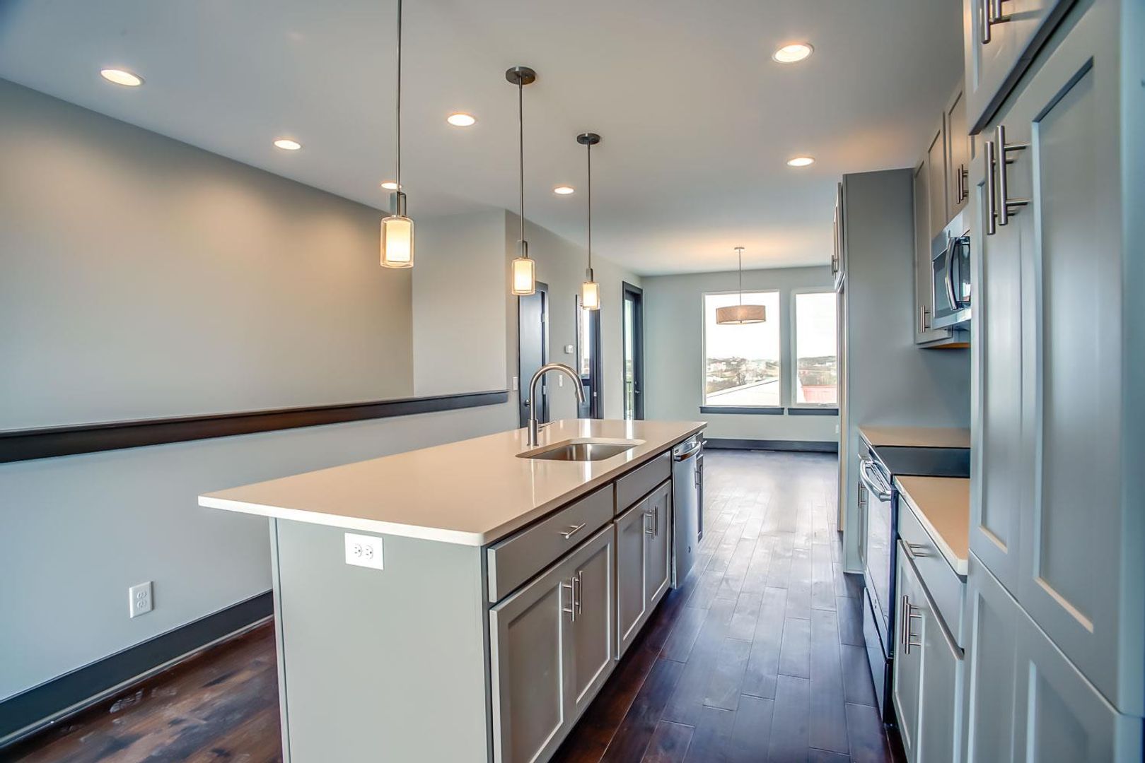 Contemporary townhome with deep 1 car garage, walk out balcony on 3rd level with skyline view. Great kitchen with quartz counters, tile backsplash, hardwoods. Great location close to the downtown and I-65 N interstate access. 2 bedrooms with 2 full baths, additional office on top floor with 1/2 bath and balcony.